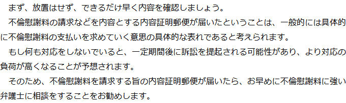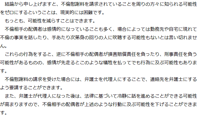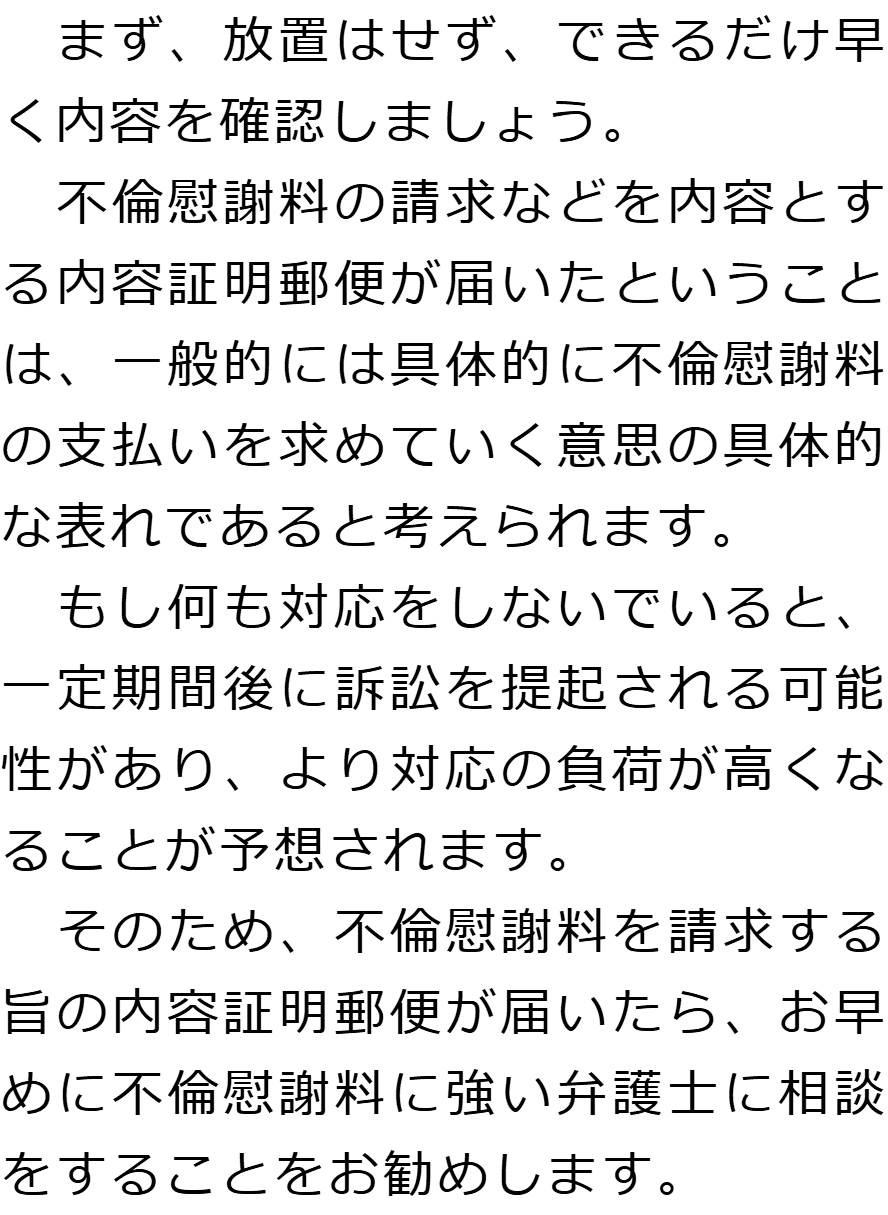 トップお役立ち情報・Q&AQ&A不倫相手の配偶者から慰謝料を請求された場合のQ&A 階層構造▼ お役立ち情報・Q&A(目次) 不倫相手の配偶者から慰謝料を請求された場合のQ&AQ内容証明郵便が届いたのですが、どうすればいいですか?Q金銭以外の賠償を要求されていますが、応じなければいけないのでしょうか?Q慰謝料を請求されていることが周囲にバレる可能性はありますか? Q内容証明郵便が届いたのですが、どうすればいいですか?AQ金銭以外の賠償を要求されていますが、応じなければいけないのでしょうか?AQ慰謝料を請求されていることが周囲にバレる可能性はありますか?A お役立ち情報・Q&A(目次)お役立ち情報・Q&Aトップお役立ち情報不貞の慰謝料請求をされた場合にやってはいけないことQ&A不倫相手の配偶者から慰謝料を請求された場合のQ&A 受付時間 平日 9時~21時、土日祝 9時~18時夜間・土日祝の相談も対応します(要予約) 所在地 〒120-0034 東京都足立区千住2-4オカバツインタワービル イースト5F (東京弁護士会所属) 0120-41-2403 お問合せ・アクセス・地図